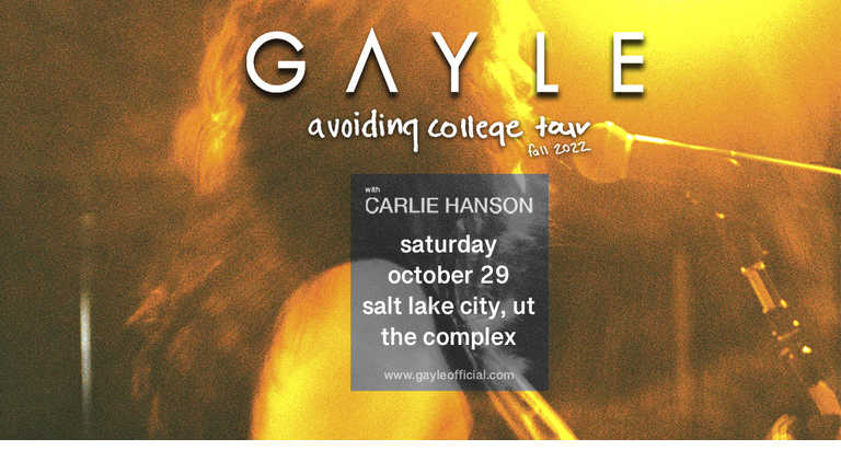 Live Nation Presents GAYLE Avoiding College Tour with Carlie Hanson Saturday October 29th at the Complex Doors: 7:00pm Show: 8:00pm Tickets on Sale Now https://tickets.thecomplexslc.com/event/gayle/tag/cslc Plus All Graywhale Stores