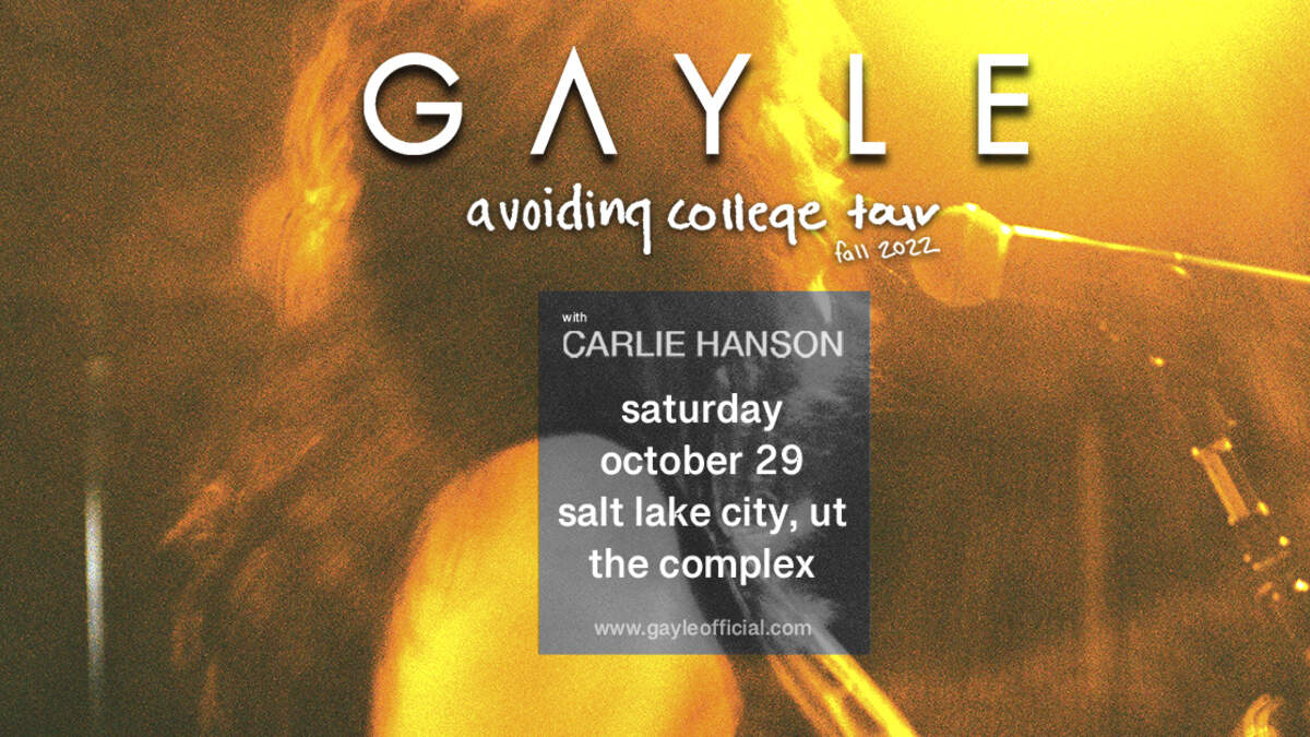 Live Nation Presents GAYLE Avoiding College Tour with Carlie Hanson Saturday October 29th at the Complex Doors: 7:00pm Show: 8:00pm Tickets on Sale Now https://tickets.thecomplexslc.com/event/gayle/tag/cslc Plus All Graywhale Stores